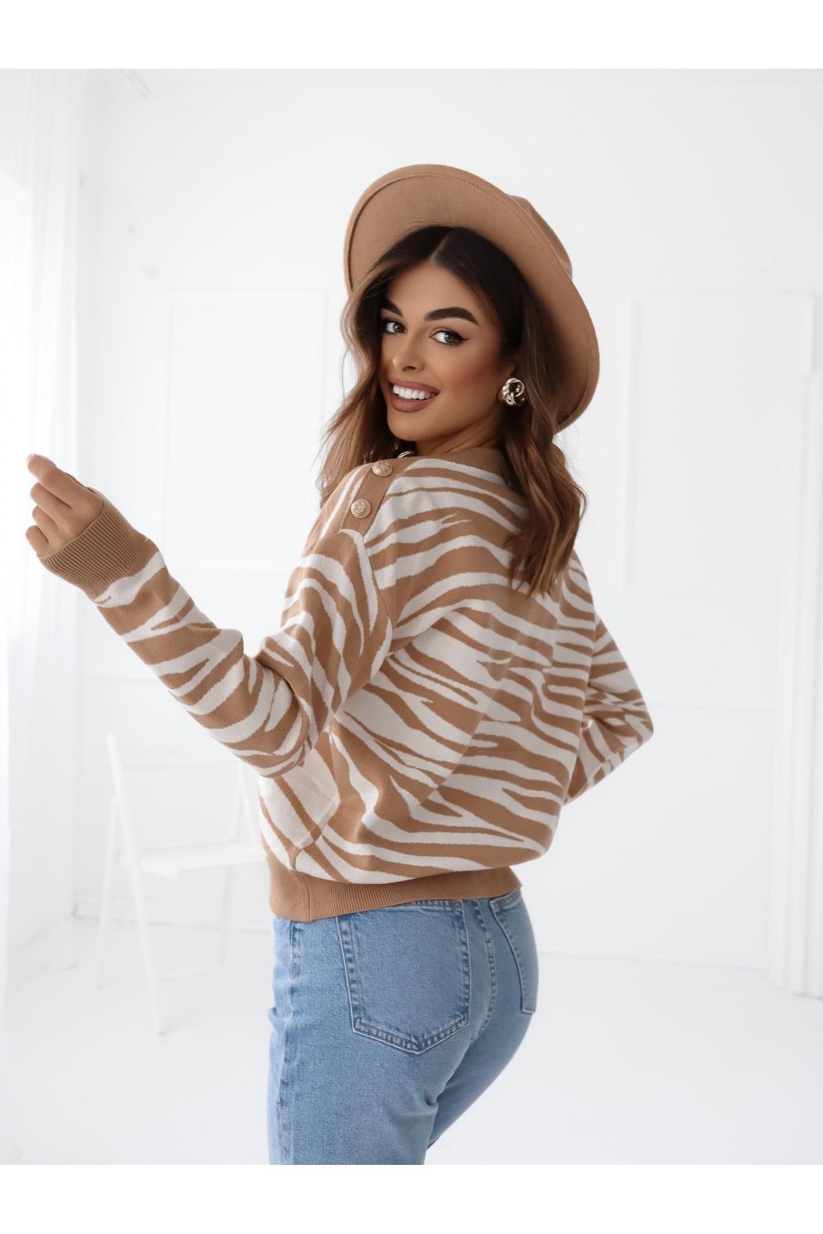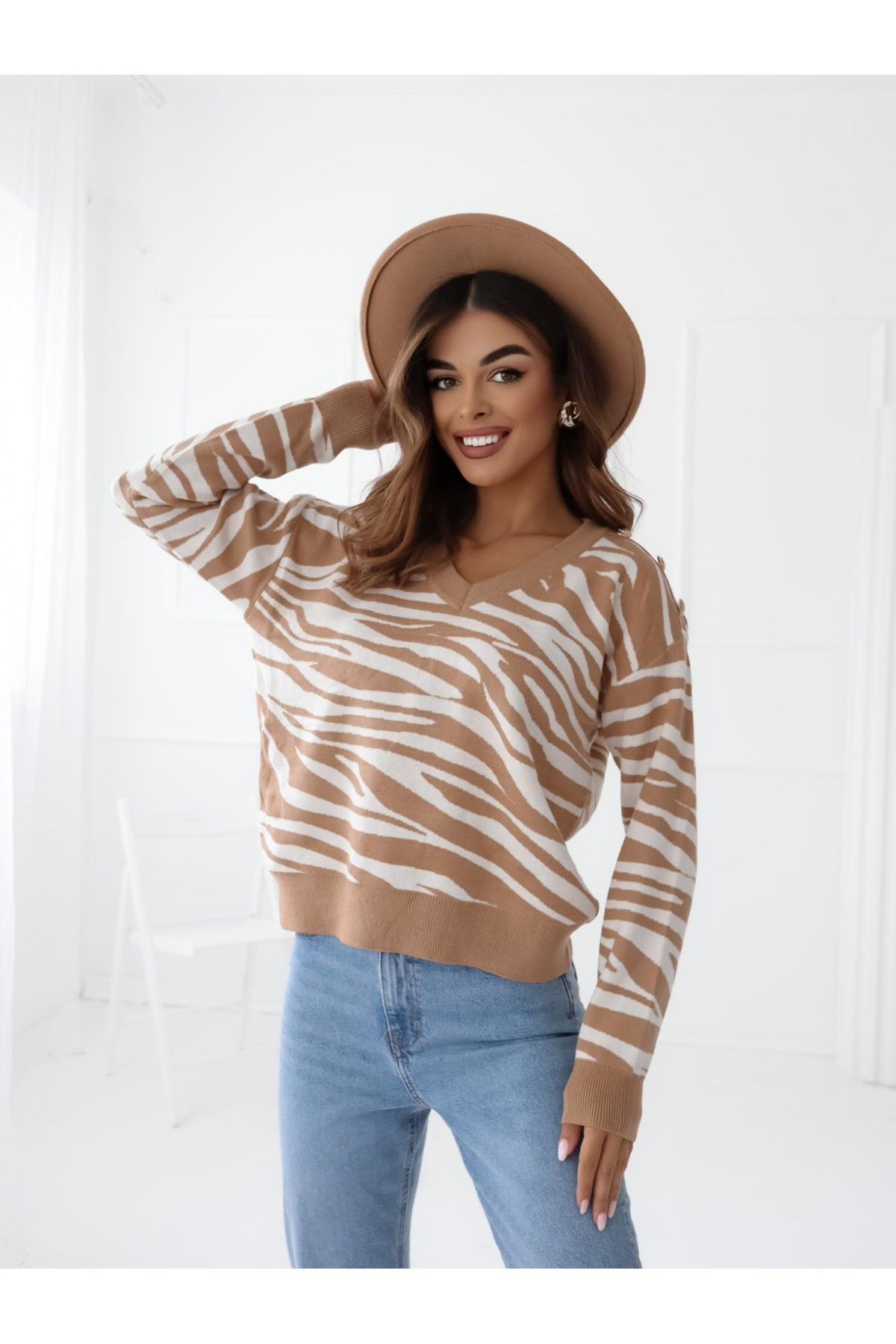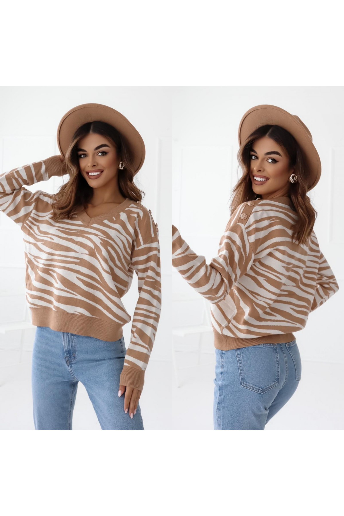 Sweterek we wzory w zebra w kolorze beżowo -białym sprawdzi się idealnie na nadchodzącą jesień i zimę idealny do spodni bądź spódniczki . Złote guziczki na ramieniu dodają mu elegancji i stylu rozmiar jest uniwersalny ale będzie pasować od rozmiaru XS do L